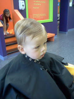 We went to Beaners, which is Canadian-based. They have several different cars to sit in while you get your hair cut. They put Grayson in the yellow Mini Coupe because it was the most contained. It didn't matter, though because Grayson sat so still throughout the whole cut. I was one proud Mama!